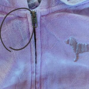Soft lavender velour hoodie with front zip. Features a small dog on the front and large print on the back.