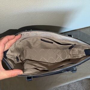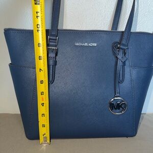 Chic and versatile dark blue tote by Michael Kors. Features sleek design and signature logo charm.