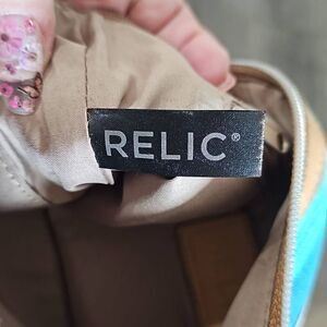 Relic Crossbody, Shoulder Bag, Purse. Striped Design. Still in great shape. Lots of use left. 1 inner compartment with a zipper pocket. 2 outside zipper compartments. One has 6 Card or ID slots. Color in some photos looks more yellow on the straps it is on the tan side. Great condition. Non-smoking home and pet-free home. Measurements approximate: 11 inches wide, 7 inches in depth, and strap is 25 inches adjusted out. Adjustable to shorten. It never hurts to make offers.