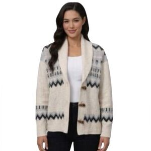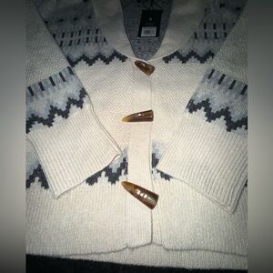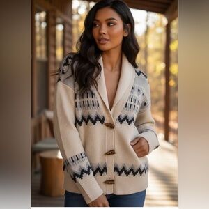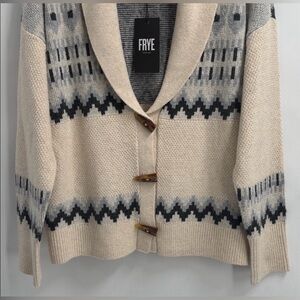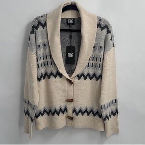 NEW FRYE OATMEAL FAIR ISLE V Neck Knit Cardigan Sweater TOGGLE BUTTONS SZ LARGE