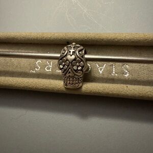 Intricate silver skull charm with detailed design.
