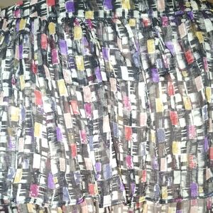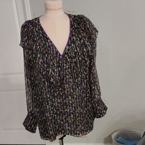 Elegant blouse with a V-neck . Features a vibrant multicolor pattern.