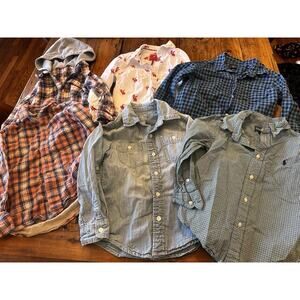 The product is a lot of 6 boys' size 5 button front shirts with long sleeves. The shirts come from brands such as Gap, Ralph Lauren, and Old Navy, offering a variety of multicolored options for young boys. Perfect for keeping them stylish and comfortable, these button-up shirts are ideal for everyday wear or special occasions.