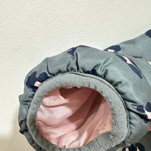 Keep your little one cozy with this adorable heavy-duty puffer jacket. It features a navy blue exterior with a pink and dark blue floral print. The interior is lined with a soft pink fleece for maximum comfort during cold weather. Includes a full zipper front, hood with sherpa-style fleece lining, and two front pockets.