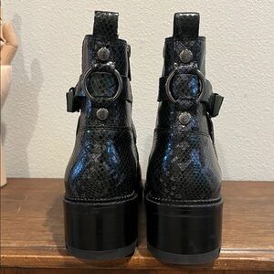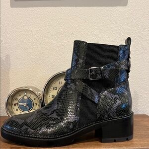 Donald Pliner snakeskin booties with a camo-like pattern in black and gray, that can also appear as lavender and olive green from some angles! The booties have a zip closure at interior. A belt effect wrapped around the ankle has cool details like the gun metal ring above heel, crossover at top and a buckle at the outer boot. Elastic panel below buckle makes for comfort and ease. Lug soles have 2” heels. The only flaw is peeling at the same seam in each boot. Otherwise perfect!