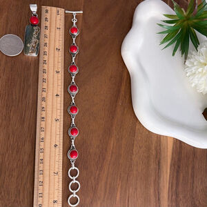 Jewelry Set Ocean Jasper and Coral Pendant and Red Coral Gemstone Bracelet 925 Stamped Sterling Silver 925 Filled Overlay Vintage Southwest Style Handmade New. 3 adjustable rings for a great fit. Genuine gemstone jewelry made well to last.