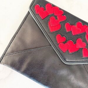 Rebecca Minkoff Leo clutch with red heart appliqués and silver zipper trim NEW!