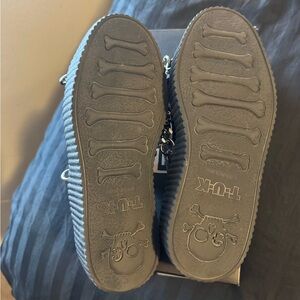 Bold black sandals featuring striking silver chain accents. Ideal for making a statement. Worn like 2-3x