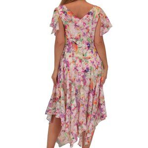 Float into any event with this beautifully feminine Robbie Bee chiffon dress. The flutter sleeves and cowl neckline create a soft, romantic silhouette, while the asymmetrical handkerchief hem adds graceful movement with every step. Designed in a watercolor floral print, this dress brings effortless elegance to daytime parties, weddings, or summer celebrations.