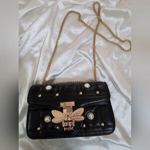 Black Quilted Faux Leather Bag with Bee Clasp & Adjustable Gold Chain