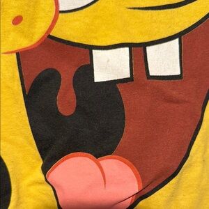This vibrant yellow tee from Nickelodeon features a playful SpongeBob SquarePants design with bold black polka dots. Crafted in a comfortable short-sleeve style, it's perfect for casual wear and showcases SpongeBob's iconic cheerful expression. Nickelodeon Yellow and Black SpongeBob Tee in guc Sz.L sold as is flaws shown in photo some light barely noticeable mark in front of tee barely cracking but lightly in print on tee. Sold as is in guc