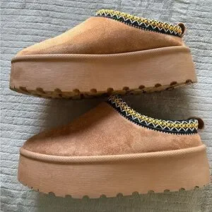 Stylish brown mules with a sturdy platform. Features intricate black and yellow accents. Ideal for casual wear. Worn a few times only so in excellent condition. From a clean and smoke/pet free environment.
