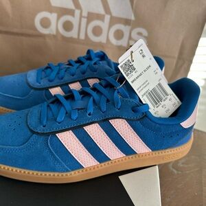 Vibrant Adidas sneakers for kids. Blue upper with pink stripes. Ideal for active days.