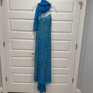 Mermaid sequin formal gown with scarf size S. Tag states size 10 but this dress runs very small. See pics for measurements. I would it’s a size 2/4. Beautiful gown with some signs of wear on the train. Otherwise in great condition . Appears all sequins are intact.