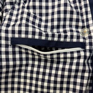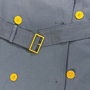 Elegant navy trench coat with gold buttons. Features a belted waist and checkered lining.