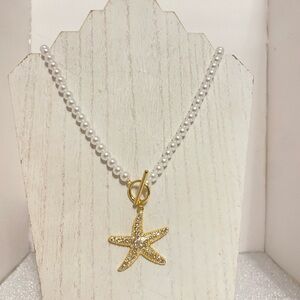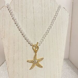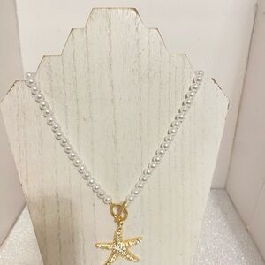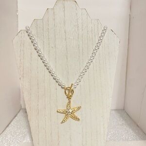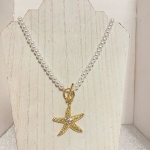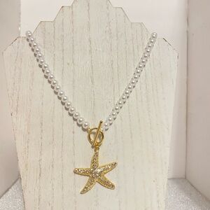 Elegant pearl necklace featuring a gold starfish pendant. Perfect for adding a touch of ocean-inspired charm to any outfit.