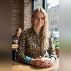 Classic Boden blouse in a brown base with teal & cream micro floral print. Button-front style with lightweight, breathable fabric—great for work or everyday wear.