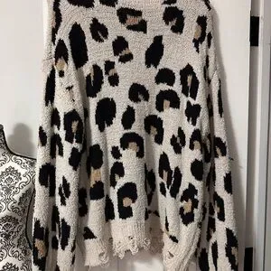 Cozy sweater with bold leopard pattern. Features cream, black, and tan colors. Perfect for casual wear.