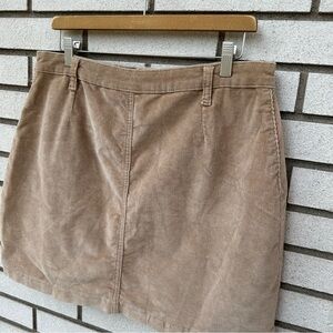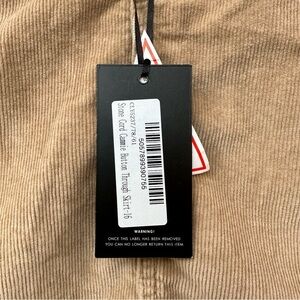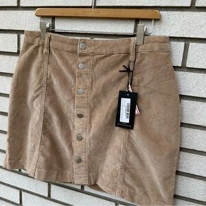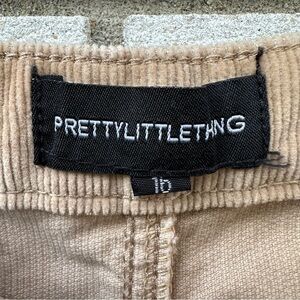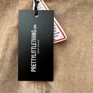 New with tags PrettyLittleThing corduroy mini skirt in a versatile stone tan shade. Crafted from a soft stretch corduroy blend of 65% cotton, 33% polyester, and 2% elastane for comfortable wear and easy movement. Designed with a flattering high-rise A-line silhouette, structured seaming, and a full button-through front closure for a polished, tailored look. A timeless neutral mini skirt that pairs effortlessly with cropped sweaters, bodysuits, boots, or sneakers for fall, winter, and transitional seasons. Size 12.