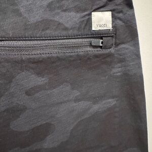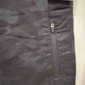Dark camouflage pants with a sleek design. Features a zippered pocket for convenience.