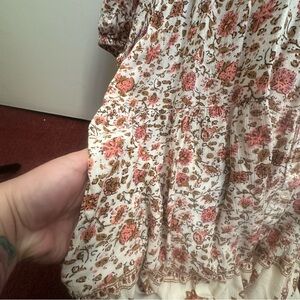 Chic floral boho dress with a relaxed fit. Features a mix of red, pink, and cream patterns.