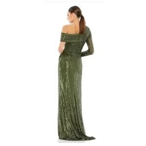 Stunning Ieena Mac Duggal olive green sequin gown. This elegant one-shoulder dress features a flattering side slit, perfect for any special occasion. Retails for $398.