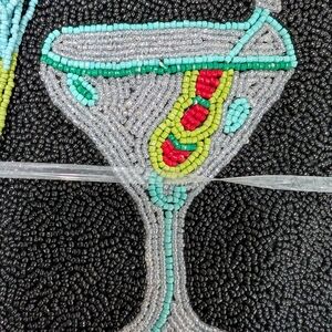 Elegant black beaded clutch. Features a colorful, martini cocktail design. Includes wristlet strap for easy carrying, and matching beaded tassel.