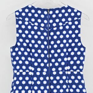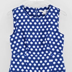 This Diane Von Furstenberg sheath dress blends timeless elegance with bold modern design. Crafted from a structured stretch blend, it features a striking blue and white geometric print that enhances the silhouette while offering a refined, tailored fit. The sleeveless cut and back zipper closure add a touch of simplicity, making it ideal for professional wear, daytime events, or elevated casual outings. DVF's signature attention to print and form ensures a look that's both polished and confident.