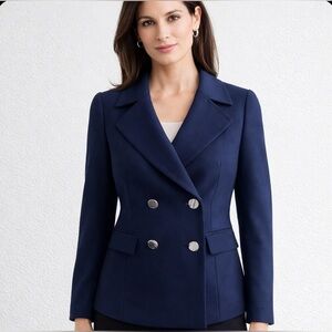 New with tags Banana Republic double breasted blazer jacket. Great for office or just casual wear. Features two front flap pockets, double breasted, slightly cropped, silver hardware, laid collar & fully lined. Buttons still have paper covering on them.