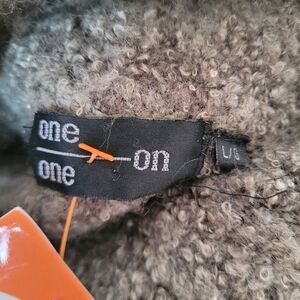 One On One thick knit sweater in green, textured turtleneck, 30% mohair, fitted stretchy cut. Size L: shoulders 16", pit-to-pit 19", length 23". Cozy, warm and comfortable, perfect for an elegant and snug winter look.