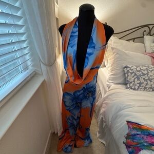 Stunning dress with bold orange and blue floral design. Perfect for any occasion.
