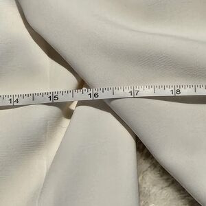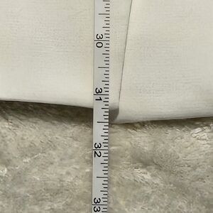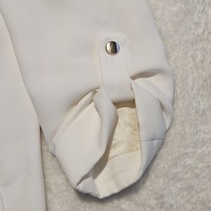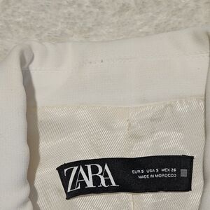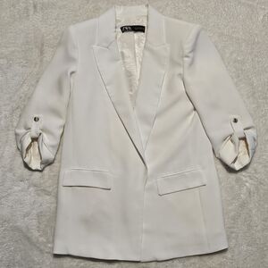 Zara size S white blazer. Good preloved condition - see pictures for a bit of residue on the inside of the collar - should go off with standard cleaning. This blazer features a clean and modern silhouette characterized by a bright optical white finish and a minimalist aesthetic. It is designed with sharp, structured shoulders that transition into a straight, longline cut, giving it an effortlessly polished look. The front is defined by classic notched lapels and a deep V-neckline, complemented by two horizontal flap pockets at the hips for a touch of traditional tailoring. The most distinctive element of the piece is the three-quarter length sleeves, which are intentionally gathered to create a permanent ruched effect. See photos for measurements.