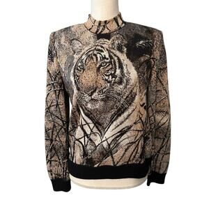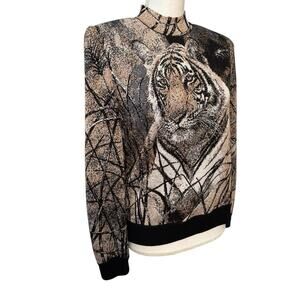 St John by Marie Grey Tiger Bling Sweater Woman S Zip Neck Metalic Bead Vinatge