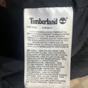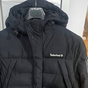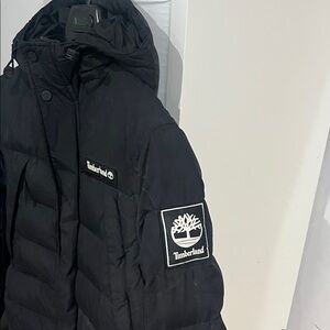 Sleek Timberland jacket in deep black. Includes a hood and signature logo detail.