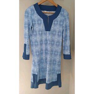 Cabana Life Moroccan Tile Dress. Size small. Blue with a geometric pattern. V neck. Three fourth sleeves. Resort, beach, cruise. UPF 50+. In nice, preowned condition. No flaws noted. Measures approximately 17" pit to pit, 33" shoulder to hem.