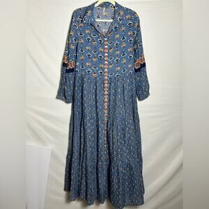 Boho Blue, Gold, and Pink Print, Maxi, Oversized. relaxed fit, Buttons down center to just above hem, Sewn tiered bottom, Long sleeve with button detail, Flowy. Material: Cotton. NWOT. Measurements: Armpit to Armpit:19 inches, Shoulder to Hem: 55 inches, Sleeve: 22 inches, Waist Across Laying Flat: 18 inches.
