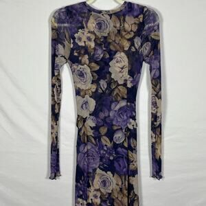 Femme and flattering, this maxi is made for a night out!. "Denim Combo" print, Slim, bodycon fit, Stretchy, Mesh fabrication. Blue, purple, tan, and cream floral print design, Fitted long sleeves, Exaggerated leg slit, Gathered waist with twisted detail. Material: Nylon/elastane. Condition: NWOT with no flaws. Measurements:, Bust; 28 inches, Hip: 33.5 inches, Sleeve:28 inches, Waist: 24 inches, Length: 51 inches