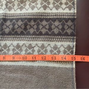 This brown and cream patterned scarf with fringe is soft and neutral for both women or men. This scarf is 100% acrylic. Hand Wash.