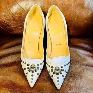 Christian Louboutin ‘So Kate’ is the Icon of all stilettos, add to that the patterned geometric studs and a piercing ring, instantly throws a rebel rockstar, skinny distressed jeans, tank top, guitar clad spoilt brat glam at you. Glossy red soles un touched by elements. Comes in it’s box ‘like’ never worn by mankind feel. What more can you ask for. Bright white like the Milky Way galaxy. Worn only a couple times indoors on carpet, also has a poly URA or Casali soles for protection. This one is for show stopping. You ought to be someone that deserves this beauty. Weak hearts stay away. Daring souls come right on in.