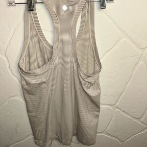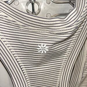 Chic Athleta tank with racerback design. White and purple stripes. Ideal for active or casual wear.