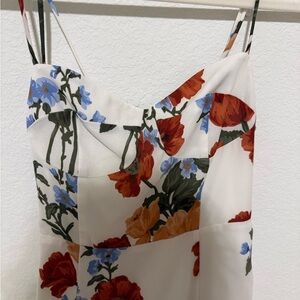 Embrace elegance with this floral spaghetti strap midi dress. Featuring a vibrant mix of red, orange, and blue flowers, perfect for any occasion.