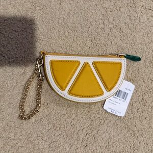 Stylish Coach yellowish orange citrus-themed (unclear if it’s a lemon or an orange) coin purse. Super cute! Features a gold chain and green zipper pull. New with tags. Small scratch on left front pictured.