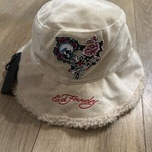 Ed Hardy Fleece Bucket Hat, Skull, Roses & Cross Embroidered Design, Beige, NEW