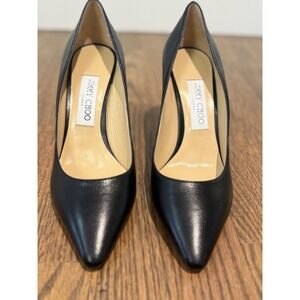 Keywords: Jimmy Choo pumps, Black leather heels, Pointed toe shoes, Stiletto heels, Designer pumps, Women's dress shoes, Classic pumps, Evening shoes, Work heels, Luxury footwear, Italian leather