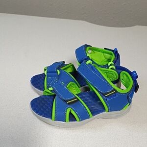 Bright blue sandals with lime accents. Easy strap closure. Ideal for playtime.