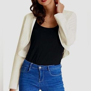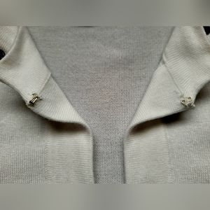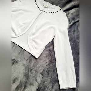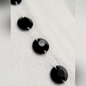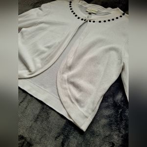 Elegant white cardigan with black studded neckline. Open front design. Perfect for layering.
