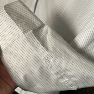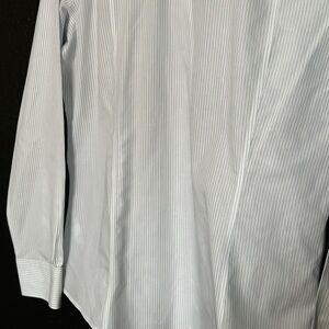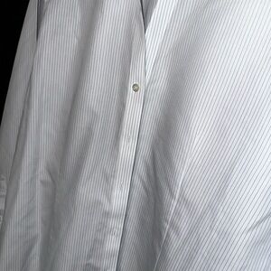 Sophisticated white w/pale blue pinstripe dress shirt. Timeless Brooks Brothers style.