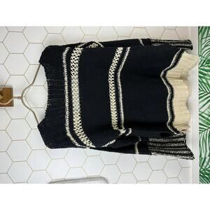 Features a black base with cream horizontal stripes and unique knit patterns.