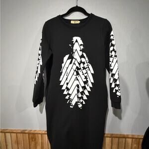 Style meets comfort in this edgy, Korean-designed sweatshirt dress. Featuring a bold, abstract chevron/figural white graphic on the front and sleeves, this piece is perfect for a streetwear-inspired look. The fabric has a nice weight to it, making it ideal for cooler weather, and it even features hidden side pockets!