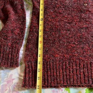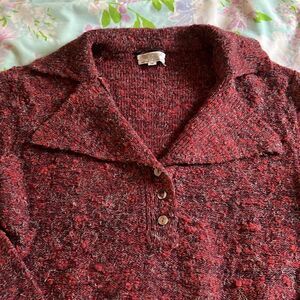 Kind of a wool boucle fabric. Very unique double, notched collar with three button front sweater. Excellent condition. Measurements in photos.